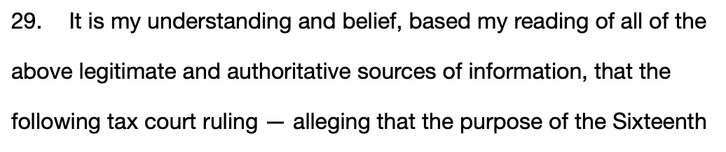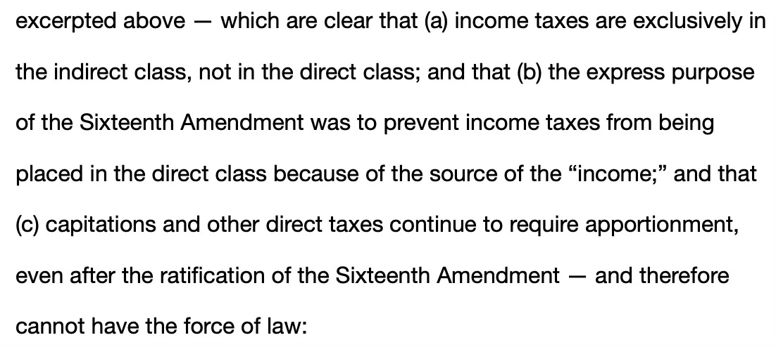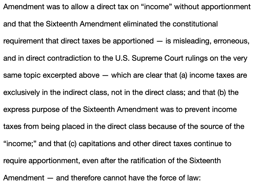 Starting with the premise that taxes are either direct or indirect, Cracking the Code lays the foundation for the remainder of the book on two fallacies. The first is that "federal direct taxes which affect citizens of the several states must be apportioned [this statement is not a fallacy per the U.S. Supreme Court that confirms direct taxes are and have always been required to be apportioned].” The Constitution at one time required this apportionment [per the Moore excerpts above, the Constitution continues to require apportionment for direct taxes]; however, with the adoption of the 16th Amendment in 1913, this rule no longer applies to income taxes [this is misleading because income taxes are in the indirect class and therefore the apportionment rule does not apply, and the 16th amendment did not change that, only that the source of “income” cannot be used to place income taxes in the direct class]. It is unclear whether the author accepts this fundamental point [it is unclear whether this judge understands this or is being deliberately vague and misleading].